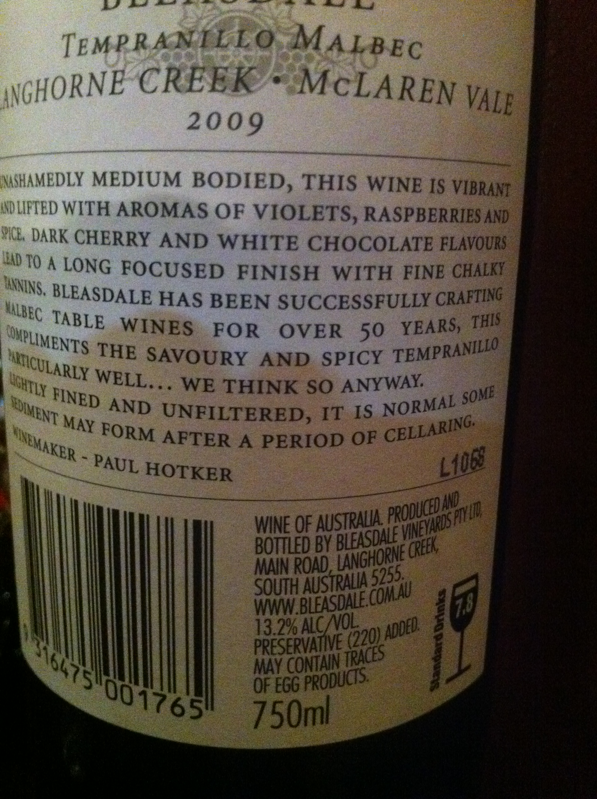 Another reason why I picked this wine is because it is such an unusual blend, Tempranillo and Malbec usually don’t go together, but this wine is typical of the freedom Australian wine makers have to blend however they like.  Tempranillo is primarily used in making the Spanish wine Rioja.  Malbec is one of the six red grapes used in making Bordeaux and is usually only added in small amounts, if at all.  The Argentinians and Chileans have taken to making some intense single varietal Malbecs, but it’s not widely made in Australia, although Bleasdale are known for their Malbecs.